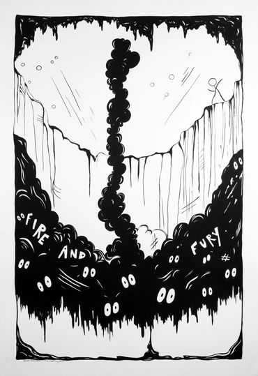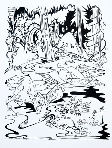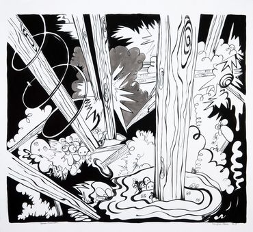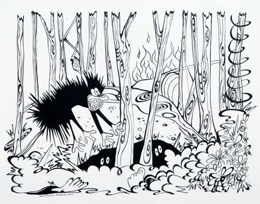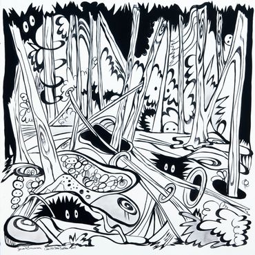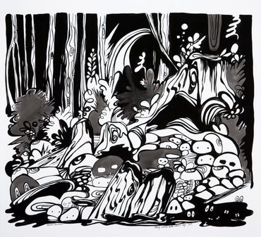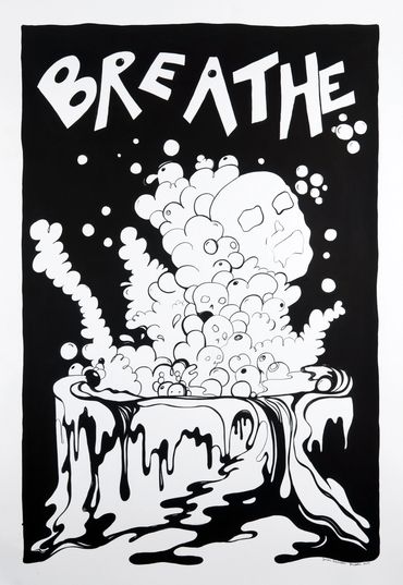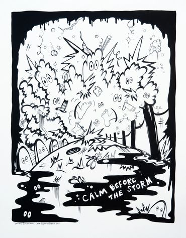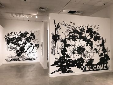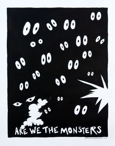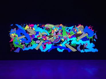 Are We the Monsters is Emerson's visual mediation on the dichotomy of destruction and creation. The installation includes a selection of drawings, murals, and a black light room with fluorescent paintings.