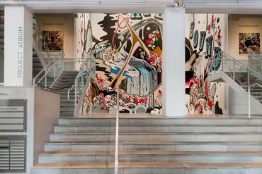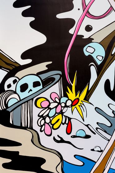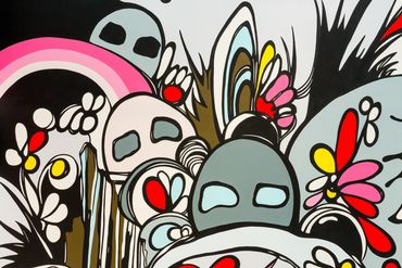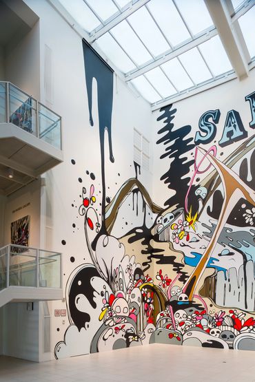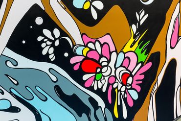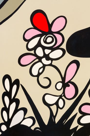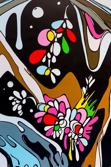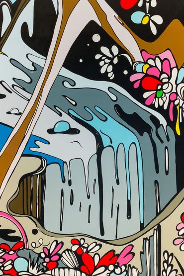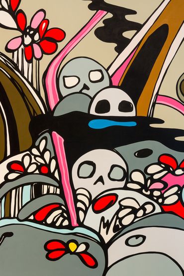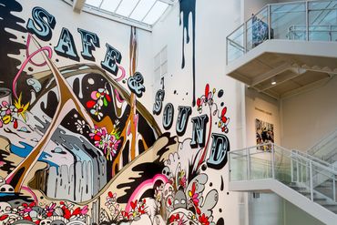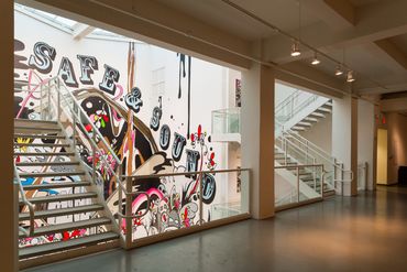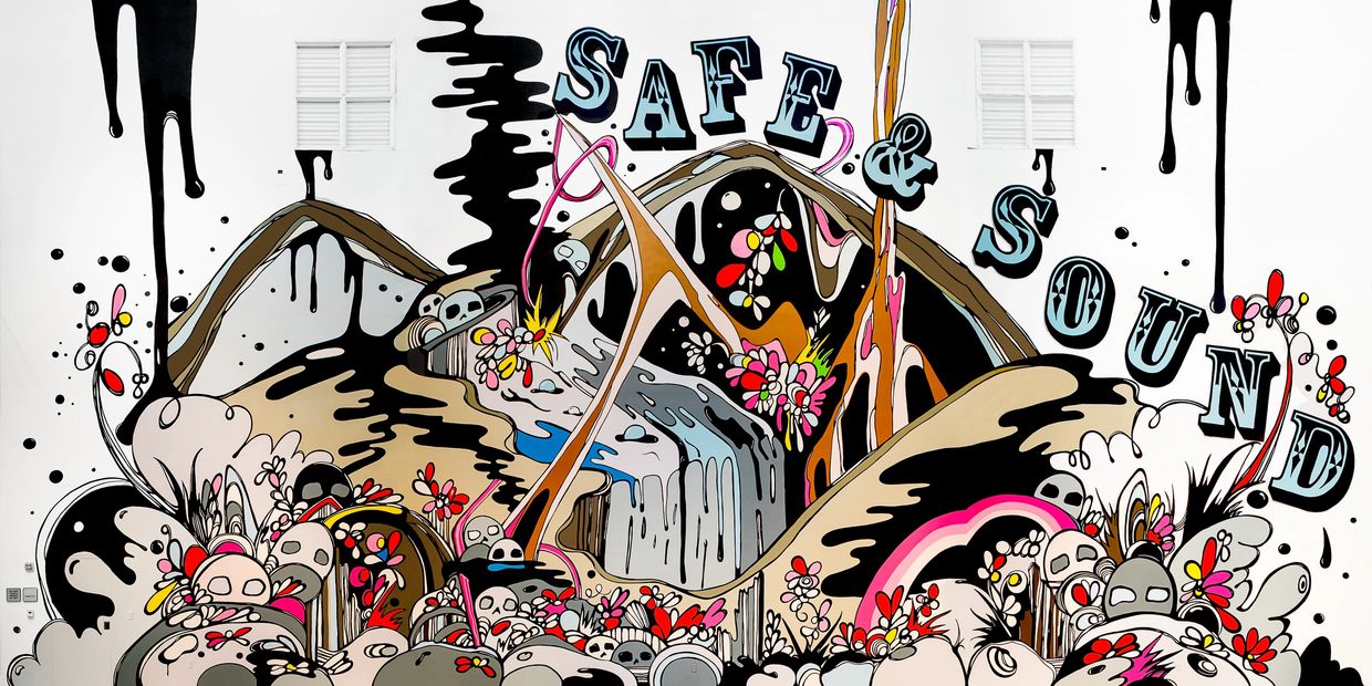 This mural was temporary and installed for the duration of the exhibition at MOCA Jacksonville in 2013. The mural was in the entryway of the museum and spanned the height of all three floors. The imagery is an abstract landscape showing a waterfall pouring out of a black pool surrounded by large rocks that resemble faces among flowers and foliage. The words at the top of the design, Safe and Sound, refer to our desire for safety and comfort amid a tumultuous and uncertain landscape.