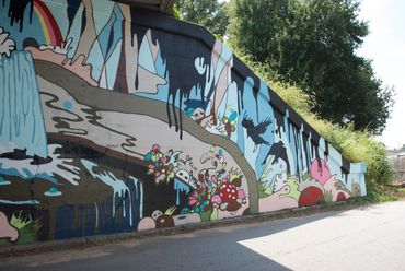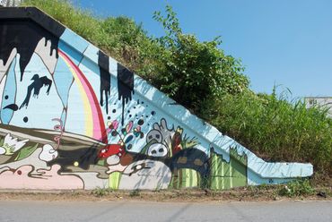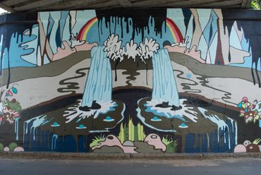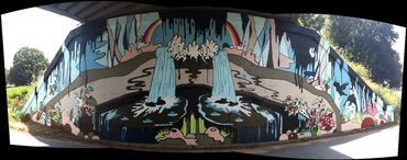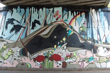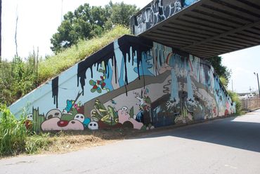 This mural was temporary (three years) and installed during the 2012 Living Walls mural conference in Reynoldstown, Atlanta, GA. The project consisted of two walls across from each other on a highway underpass. The composition is an abstract landscape with trees, flowers, locusts and black birds circling the sky. The imagery reflects on the endless beauty of life amid the whirlwind of a cultural landscape perpetually defined by social and environmental change.